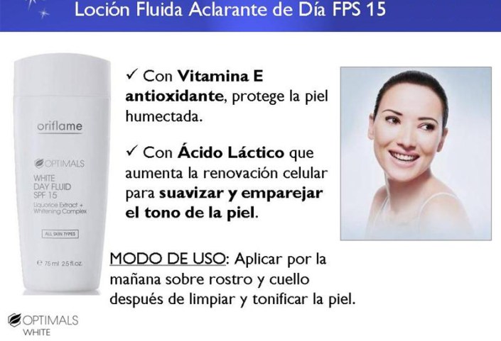 Loción Fluída Aclarante de Día FPS 15 – Código 12552 : Con Vitamina E antioxidante para proteger y mantener la piel humectada y ácido láctico que aumenta la renovación celular para suavizar y emparejar el tono de la piel.