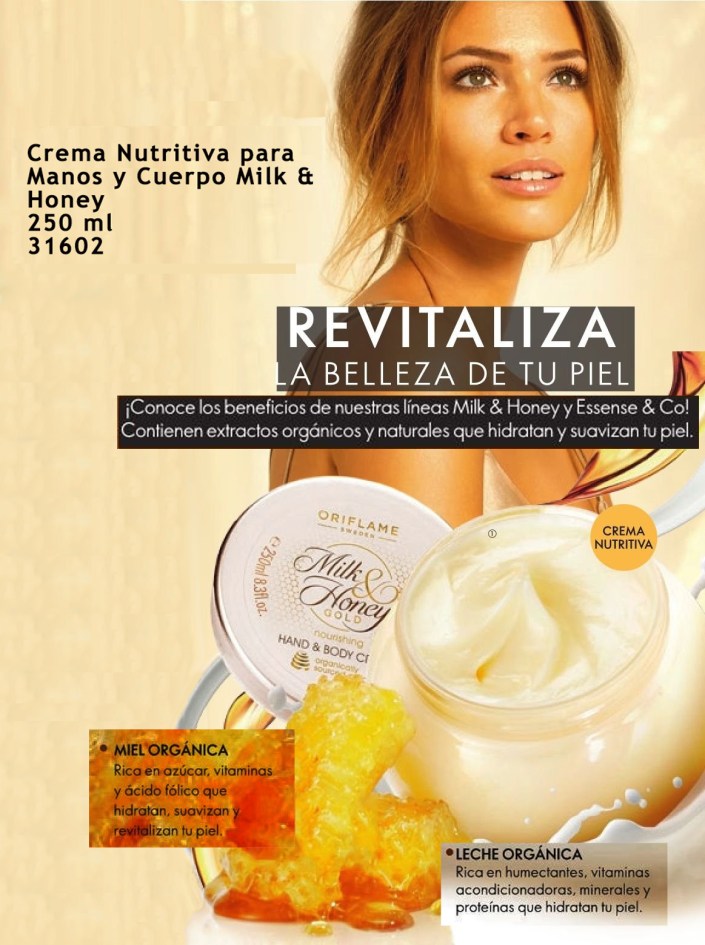 La Crema Nutritiva de Manos y Cuerpo Milk & Honey de Oriflame, (antes Código 15570, hoy en 2018 el código es 31602), fue la crema de 250 ml que me capturó para Oriflame, tenía el problema de resequedad y sensibilidad en la piel de mis muslos. Esta crema se absorbe muy rápidamente, para piel seca y de un aroma floral intenso sin ser penetrante. Es decir que una vez que se aplica a la piel, el aroma baja a niveles suaves y la crema en sí engríe tu piel como nunca antes lo había hecho una crema. Me encantó que se absorbe rápidamente, y no me deja sensación alguna de humedad o grasitud sobre la piel, sólo una clara y visible mejora en el aspecto de la piel por la hidratación inmediata. Su textura al tacto es muy suave y ligera, lo que facilita la aplicación de la crema, es de alto rendimiento y no mancha la ropa.
