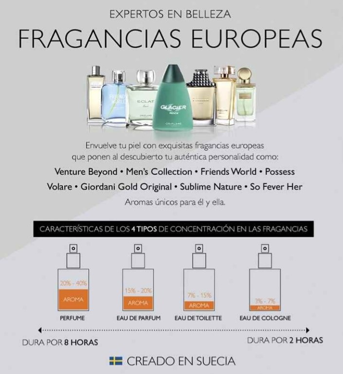 Las Fragancias Oriflame tienen diferentes tipos según la concentración de sus esencias y por ello la duración de su aroma varía, además de tomar en cuenta el tipo de piel.