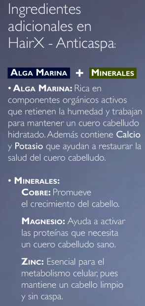 Fitonutrientes, se encuentran en las plantas y son naturalmente ricos en proteínas y lípidos, similares a los que se encuentran naturalmente en la estructura del cabello y que son esenciales para un cabello saludable. Extraído del aceite de semilla de soja y cártamo, el complejo de fitonutrientes HairX está diseñado para emular la naturaleza y crear un equilibrio perfecto que ayuda a proteger, nutrir y reparar el cabello desde adentro hacia afuera.- Alga Marina, cuyas propiedades naturales retienen la humedad para mantener el cabello hidratado. Con calcio y potasio para nutrir el cabello.