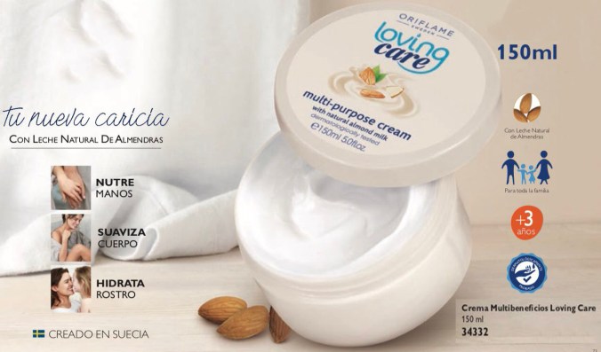 La exitosa línea de cuidado corporal para toda la familia LOVING CARE de Oriflame fue extendida con la inclusión de la CREMA MULTIBENEFICIOS LOVING CARE, en un pote de 150. código 34332, para usarla en rostro y cuerpo, de uso UNISEX (hombres y mujeres).
