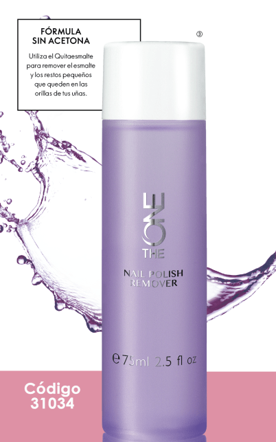 7. QUITAESMALTE O REMOVEDOR DE ESMALTE, código 31034, 75 ml, fórmula libre de acetona para remover el esmalte de tus uñas y orillas alrededor de las uñas de esmaltes Oriflame y otras marcas, incluyendo los metalicos. No daña las manos y tiene un suave aroma con vainilla.