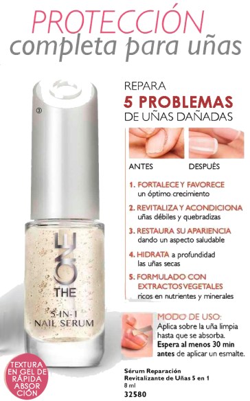6. SERUM REPARACION REVITALIZANTE DE UÑAS 5 EN 1, 8 ml, código 32580. Producto en textura gel que ayuda a su rápida absorción, para corregir 5 problemas en simultáneo: