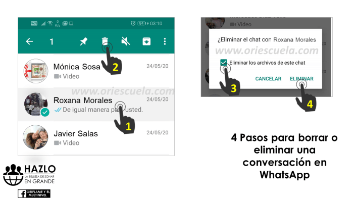 • Para ELIMINAR UNA CONVERSACIÓN O GRUPO, solo debes seguir estos 4 pasos: