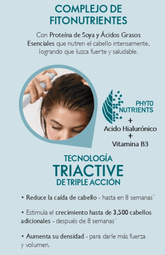 - Complejo de Fitonutrientes con Proteína de Soya y Ácidos Grasos Esenciales que nutren el cabello intensamente para lograr brillo, vida y fortaleza.