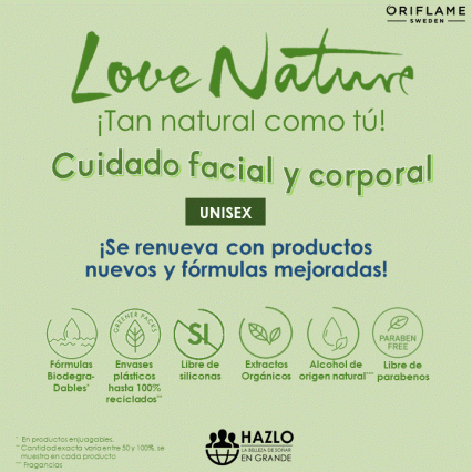 Love Nature, es la línea UNISEX (para hombres y mujeres) de aseo y cuidado de la piel (rostro y cuerpo), a base de ingredientes orgánicos vegetales (no usan químicos ni pesticidas en el cultivo de estos ingredientes), productos biodegradables que no dañan el medio ambiente, libre de parabenos y siliconas, y con envases plásticos hasta 100% reciclados con un alto nivel de sustentabilidad. Dermatológicamente testeados o probados con rigurosas pruebas de seguridad de la Comunidad Europea.