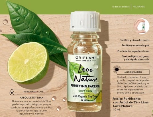 - Aceite Purificante con Árbol de Té y Limón (Purifying Face Oil), frasco de 10 ml, código 34849. excelente aceite para combatir imperfecciones de la piel (granos, hongos y/o ronchas) desde la primera aplicación, purificándola sin resecar.