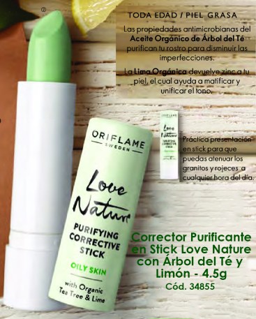 - Corrector Purificante en Stick con Arbol de Te y Limón (Purifying Corrective Stick), código 34855, en barra de 4.5 g. corrector de imperfecciones (acné, rojeces, heriditas, ronchas, etc), disimulándolas pero también purificándolas con agentes anti microbianas. En formato de barra ideal para llevarlo a todos lados. Con zinc para matificar la piel y unificar el tono.