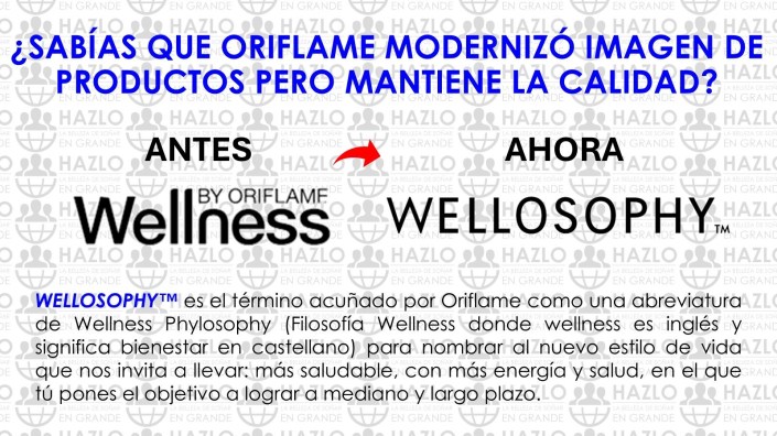 WELLOSOPHY™ es el término acuñado por Oriflame como una abreviatura de Wellness Phylosophy (Filosofía Wellness) para nombrar al nuevo estilo de vida que nos invita a llevar: más saludable, con más energía y salud, en el que tú pones el objetivo a lograr a mediano y largo plazo, porque para Oriflame no todo se reduce a vender productos, sino que también se desea que las personas logren sus propios objetivos en comunidad y a través de pequeños cambios progresivos que harán la diferencia en la vida de quien los sigue y su entorno.