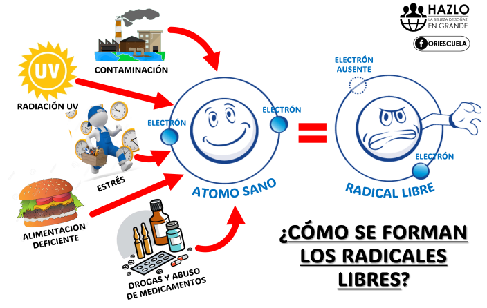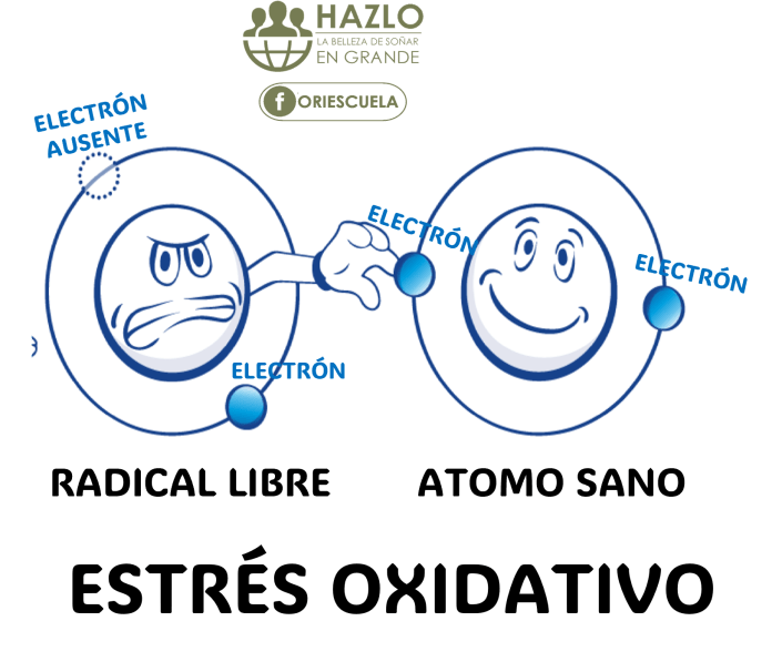 En la regeneración celular de las células del cuerpo humano, hay distintos mecanismos biológicos que se ejecutan para su reproducción y cumplimiento de funciones, los mismos que son controlados por el cuerpo, pero debido a diferentes razones como: alimentación desordenada y deficiente, exposición larga al sol y sin protección, contaminación por humo, tabaco, abuso de alcohol, consumo de drogas, abuso de medicamentos, etc. algunos átomos de oxígeno (que son parte de las células) quedan solo con un electrón libre (deben ser de a dos normalmente) y van quedando incompletos. Estos átomos incompletos por tener solo un electrón son los llamados «radicales libres» y a pesar de su corta vida restante, empiezan a interactuar con otros átomos componentes de las células para tomar de ellas el electrón que les falta, alterándolas en su ADN, dejándolas incompletas y volviéndolos también radicales libres que a su vez irán a tomar lo que les falta de otros átomos y células, provocando una reacción en cadena de radicales libres que dañan, envejecen y matan células, tejidos, órganos y piel. Este proceso en cadena es lo que llamamos «estrés oxidativo».
