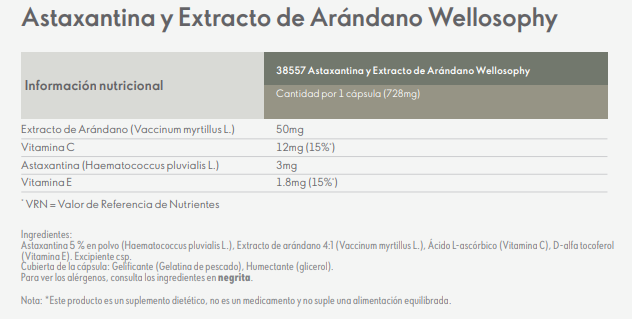 Cantidad por 1 cápsula: Extracto de Arándano 50mg, Vitamina C 12mg (15%*), Astaxantina 3mg, Vitamina E 1.8mg (15%*).