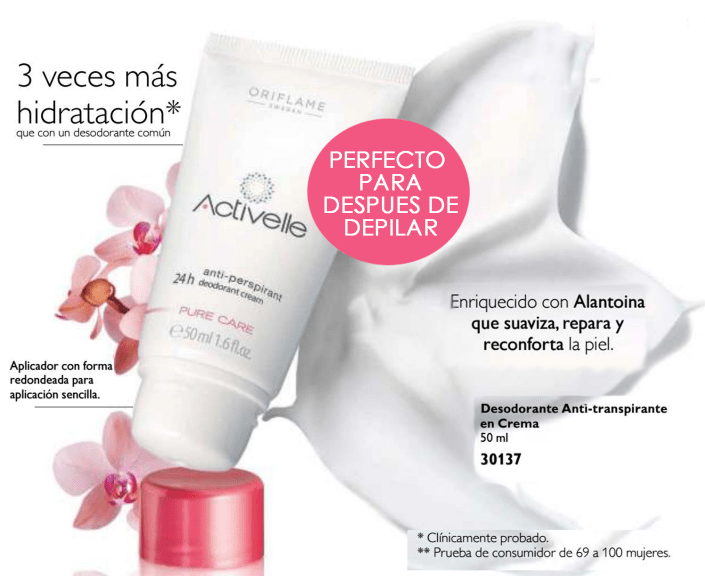 Desodorante Antitranspirante en Crema, código 30137,con 150 ml. Fórmula de rápida absorción, ideal para usar después de depilar porque contiene alantoína para calmar la piel y con su fórmula cremosa hidrata la piel delicada de las axilas.